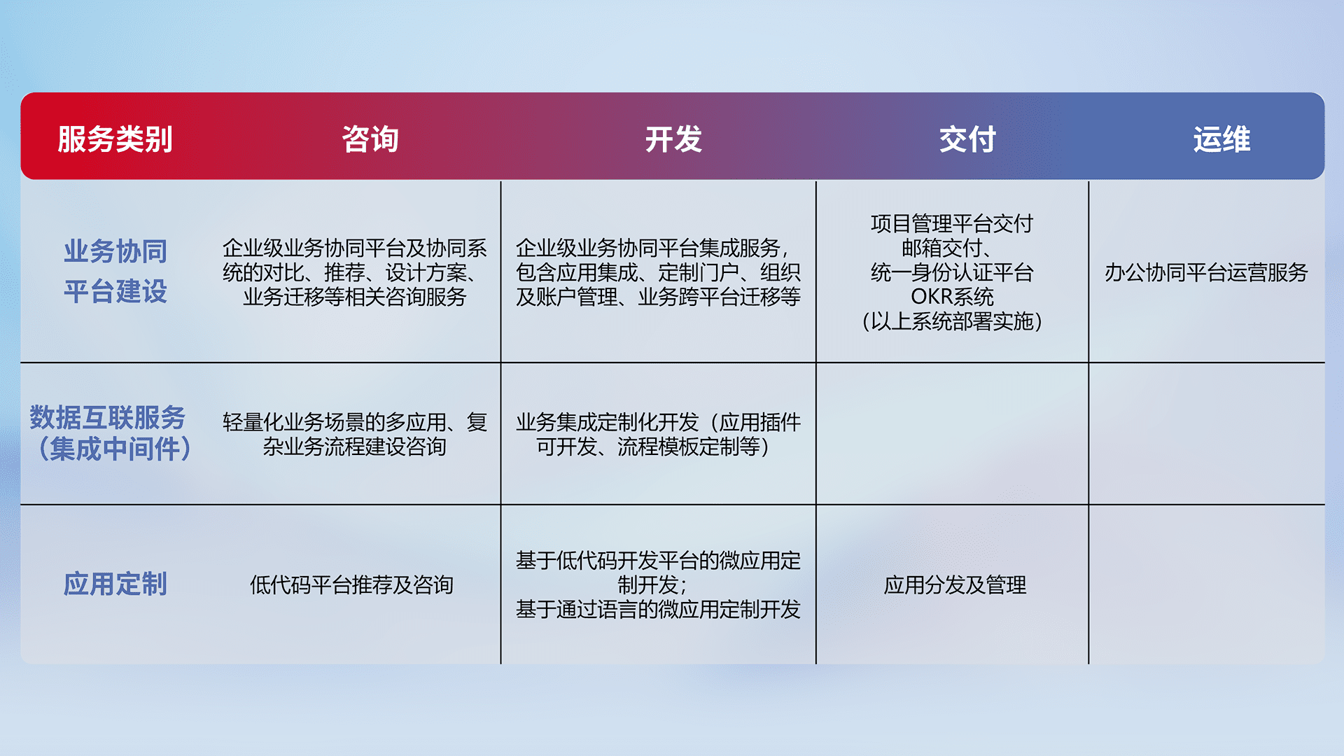 针对钉钉、、企微、、、、IDaas等平台级产品提供产品的规划、、、、方案、、、、交付、、定制化开发等服务,,,实现如统一协同办公、、、智能客户服务、、混合会议管理、、、智能数据查询、、、等业务场景,,,实现数字化转型。。