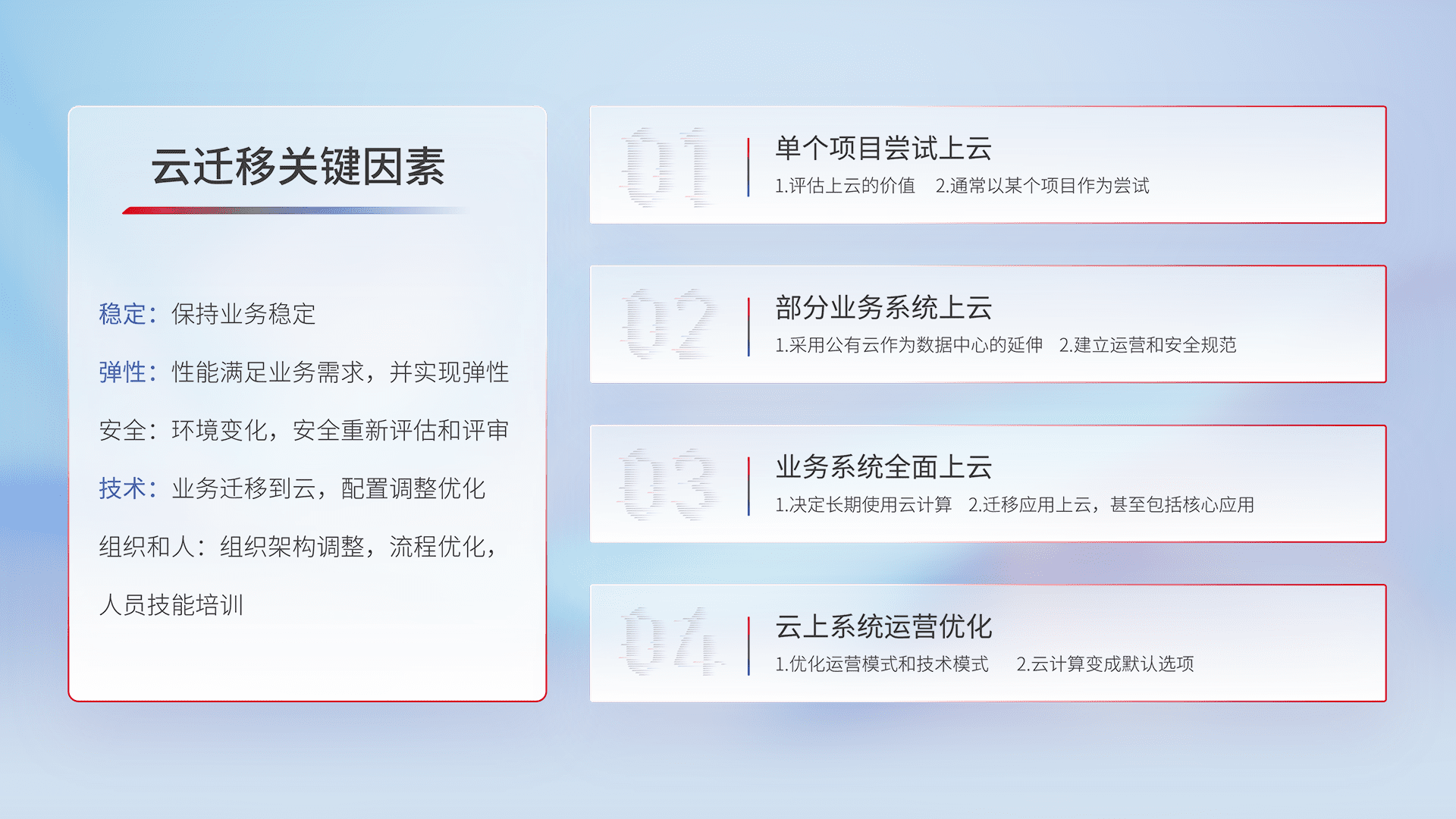 结合实际业务,,,从规划设计、、云平台选型、、云原生改造、、、数据迁移、、、、集成交付,,,迁移全过程为客户识别最佳上云路径,,,做好风险识别管理,,,,设计网络架构、、身份权限、、、、安全审计合规、、操作审计、、日志审计、、监控告警策略、、、、多站点容灾设计等,,,,对云上基础设施进行整体规划,,,提升IT治理水平,,,,以满足弹性、、高可用、、、高性能的需求。。。。